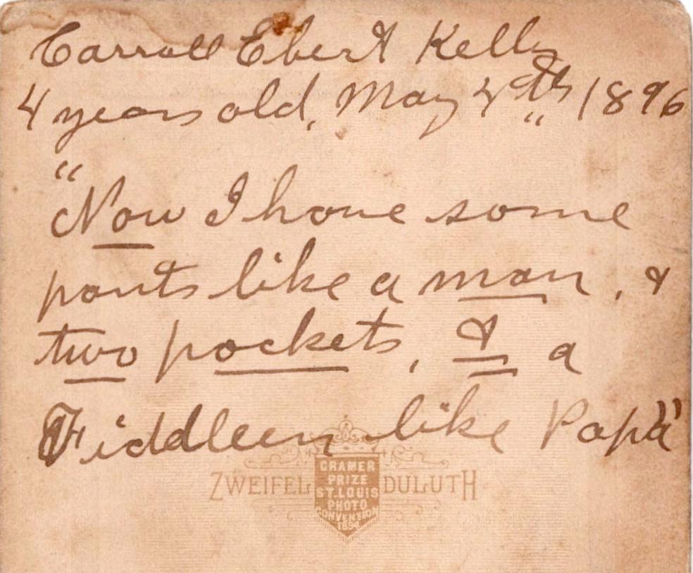 This seems to be a portrait to commemorate the breeching of an American boy. The portrait was taken May 4, 1896. He was Caroll Ebert Kelly who lived in Duluth, Minnesota, a hub for cargo shipments in the Great Lakes. Caroll was 4 years old. We do not know if he just turned 4, but this seems likely. His parents may have seen this as the appropriate age to breech him, but not yet to cut his hair. Caroll has long hair, but not curled. This was unusual. Most American boys with long hair during the Fauntleroy era had it curled. Caroll has a two colored wide brimed hat, sonmething we do not often see. The brim is not as wide as some at the time. He wears a summer-weight cut-away jacket suit, but without Fauntleroy trim, at least we do not see any. He does have a large floppy bow which covers his collar. The knee pants seem slightly large, probably mother bought a size for him to grow into. The long stockings abnd high-top shoes were strandard. His parents have written on the back, "Now I have some pants like a man & two pockets & a Fiddleen like Papa." It is written as if Carroll said it, but sounds more like this was how his parents were thinking. It would be interesting to know just what Carroll was thinking. The mount is interesting. It was one of the new style mounts, showing that they began to appear before the turn-of-the century. Actually it was the earliest example we have found of the new style mount. The studio was Zweifel in Duluth.