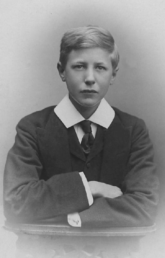 This boy is G.V. Naylor-Leyland. His full name was George Vyvyan Naylor-Leyland. We believe he was born about 1892. Standing as his godfather was George, Prince of York, who became King George V. George was about 15 years old when this portrait was taken in his Eton School uniform. We know nothing about the boy. As an Eton student at the turn of the 20th century, he must have come from an affluent family. Scholarships now help a substantial number of bright boys from middle-class families attend Eton, but this was not the case in the 1900s.