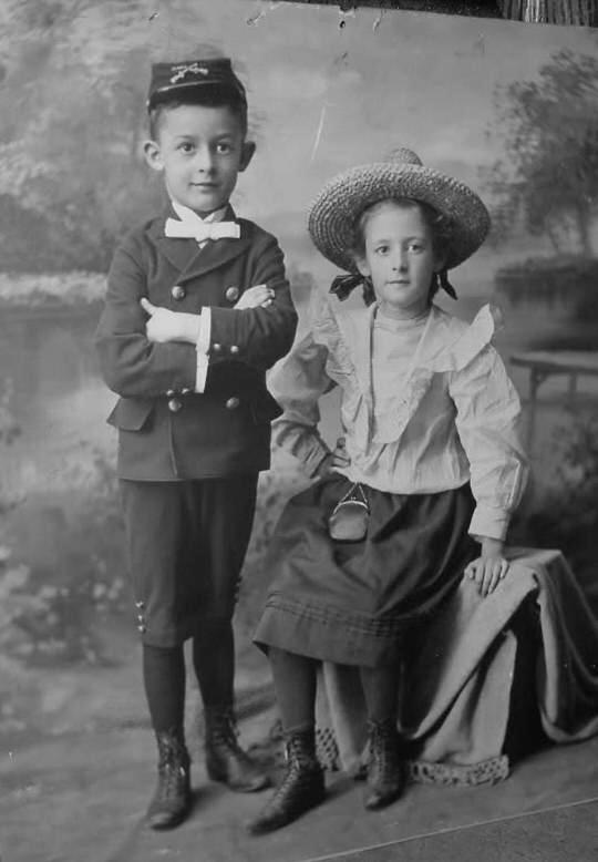 and Joseph Longcoy (1891–98) who, also died verry young. Nothing is known of Ms. Quintin as she was not a family member. We do not know why she was staying with the Longcoy family. Grant is wearing a Civil War-era kepi with the infantry crossed rifles insignia. The kepi was a Civil War-style, but continued to be worn for more than two decades after the War. He has a wing collar, not very common for boys. The portrait was taken in the middle of the Fauntleroy era, but clearly Grant's parents opted for a much more restrained outfit for him. Interesting that a 'prominent' family rejected the contemporary fashionn trends. Also notice the small white bow, not very common at the time. He has a double-breasted knee pants suit with long stockings. Frances wears a sailor-styled blouse, but without the striped detailing. We are not sure if it would have been called a middy blouse. Usually stripes are associated with middy blouses, but it is interesting to see girls wearing sailor styles by 1880. Notice that she is wearing a skirt and not a dress. Frances wears long stockings like Grant. As Grant looks to be about 4-5 years old, the portrait would have been taken about 1890. Longgoy married Edna Lucile Fluke Longcoy (1891–1967) in 1922.
