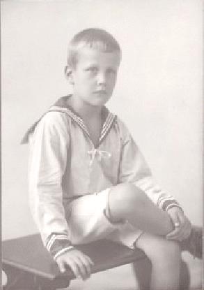 He wears a clasic sailor suit with above the knee knickers and light-colored long stockings. Presumably he wore it to school and was one of his dressup outfits as he had his portrait taken in it. The styling is classic including the three traditional stripes. He wears it, however, without a scarfe or whistle. Note the above the knee knickers that were woren in the 1910s and early 20s. A HBC reader writes, "Are you certain the boy is wearing above-the-knee and not short pants? They look like short pants to me." HBC is not positive. We do not have the original portrait and thus all we have to go on is the scan shown here. We think that they are knickers for several reasons. Short pants in 1921 were still not common in America. Even the Scouts did not wear them. Most boys wore either kneepants or knickers. Also look at the pants hem on both legs. While not baggy like some knickers, the pants leg does seem to blouse out slightly from the leg. The hem does not appear to be open as with either shorts or kneepants. HBC is also not sure about the color, but the suit does not appear to be white.