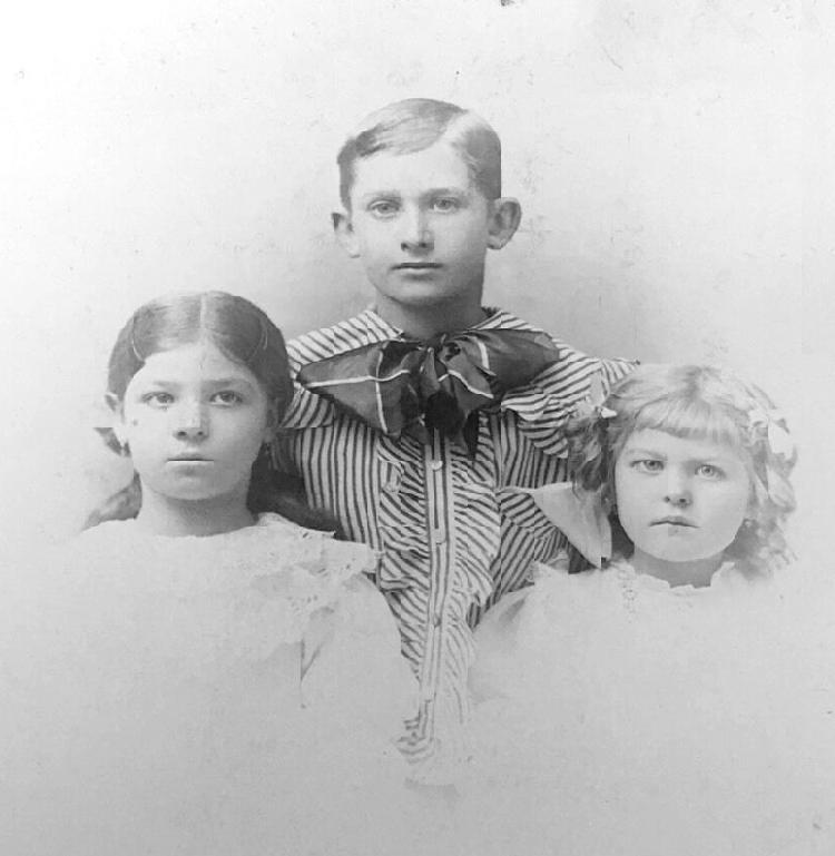 This 1896 cabinent card shows the three Mayer children. The are Carrie Al, Florence, and Adolph Mayer. They look to be about 6-12 years old, perhaps 13 years old. We are a little unsure about Adolph's age. The girls wear white dresses with lacy collars. Adolph wears a fancy striped Fauntleroy blouse which has a large ruffled collar and front placket. He also has a floppy bow. This was an optional item. People in the 1890s tended to dress formally. Boys during the summer might just wear fancy blouses like this. This was the origin of the expression 'shirt-sleeve youngsters'. The studio was Lyman and Wells in Columbus, Ohio. The cabinet card used the term 'Paris Finish' We have no idea what that means.