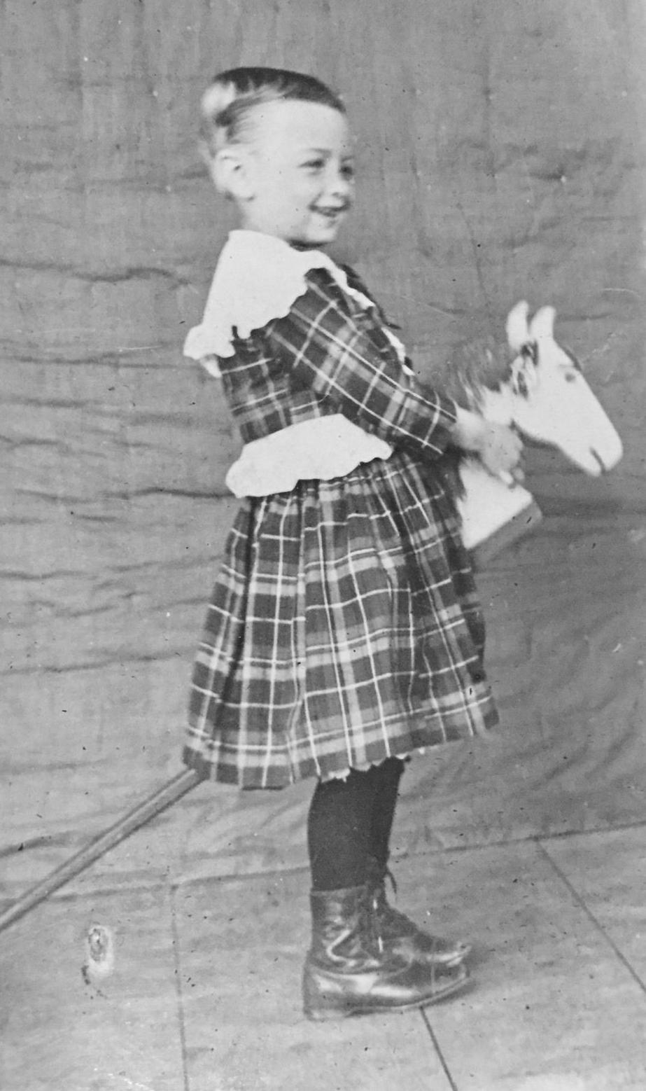 The boy in this 1903 cabinet card portrait is identified as Wayne Mayo. He is pictured with a wooden stick horse which he seems to be enjoying. Wayne wears a tartan dress, it was a bright plais pattern. Wayne's dress was done with a large ruffled collar and matching white ruffled waistband. This was rather unusul. Plaid was a popular dress pattern for boys because it was associated with kilts. The skirt is, however, not pleated like a kilt. Dresses were going out of style for boys in the 1900s, but the convention had not yet disappeared. The hem was knee length as was standard for young, but not yet teenage, girls. The dress seems to be worn with a frilled petticoat which can just be glimsed at the hem. He has black long stockings and high-top shoes which were virtually universal at the time. The shoes seem to be lace ups, buttonshoes were more common at the time. Wayne was 'probably age 4'. The imprecesion means that the notation was made some time after the portrait was taken. But as the date is known, we can assume that the age estimate is fairly accurate. The cabinet card is one of the new style card, this one slightly larger. With an image that covered most of the card. At the same time there were also small cards with small images. The card measured 6-1/4 by 5-1/4 in. The photographic image is 5 by 4 in. The studio is not identified, but given the basic back drop and poorly composed pose, was clearly not a well-estblished or very competent phototographer.