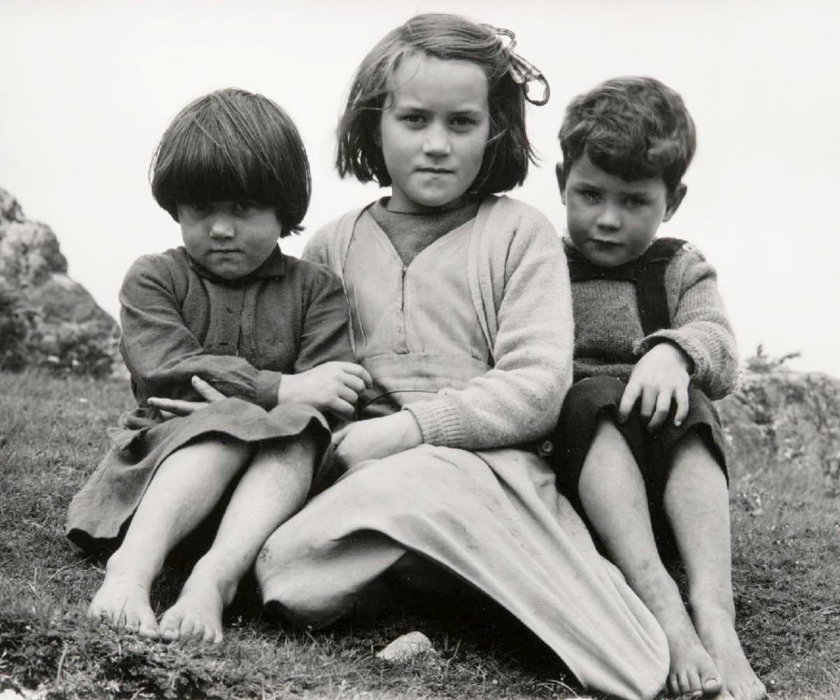 This photograph was taken in 1954 on South Uist, the second largest island Outer Hebrides. The names of the three children are Agnes MacDonald along with Morag and Ewan MacLellan. They are clearly not glad to have the photo taken. Perhaps they weere shy, but an experienced photographer knows how to make the people being photographed at ease. This is a little unusual because children this age are normally happy to have their photograph taken. Teenagers and adults are often notb so pleased, but younger children commony think it is fun to have their picture taken. And the phiotographer was Margaret Fay Shaw a local photographer who took numerous phothgraphs on the island and would have been know to the children. At the time most children on the Hebrides, like these children, still commonly went barefoot. We are not even sure that the children had shoes. The older girl may be hiding her feet.