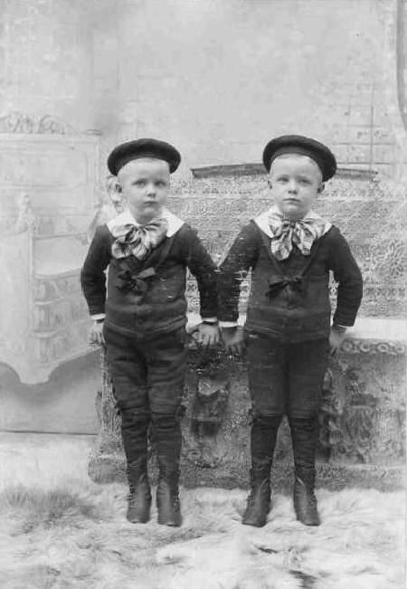 Two cabinent card portraits show twins Harold and Howard McCay. They look to be about 5 years old. The portraits were taken at the Smith studio in Wilmington, Ohio. They are undated, but we would guess the early 1890s. The first portrtait shows rhe boys wearing identical sailor caps with wite Eton-like collars, and plain middy blouses, knee pants and long stockings. Dressing twins identically was a popular convention. Mother had added matching floppy bows, but not as large as some we have seen. Mixing Eton collars and middy blouses was rather unusual. Another portrait shows the boys sitting down without their caps.