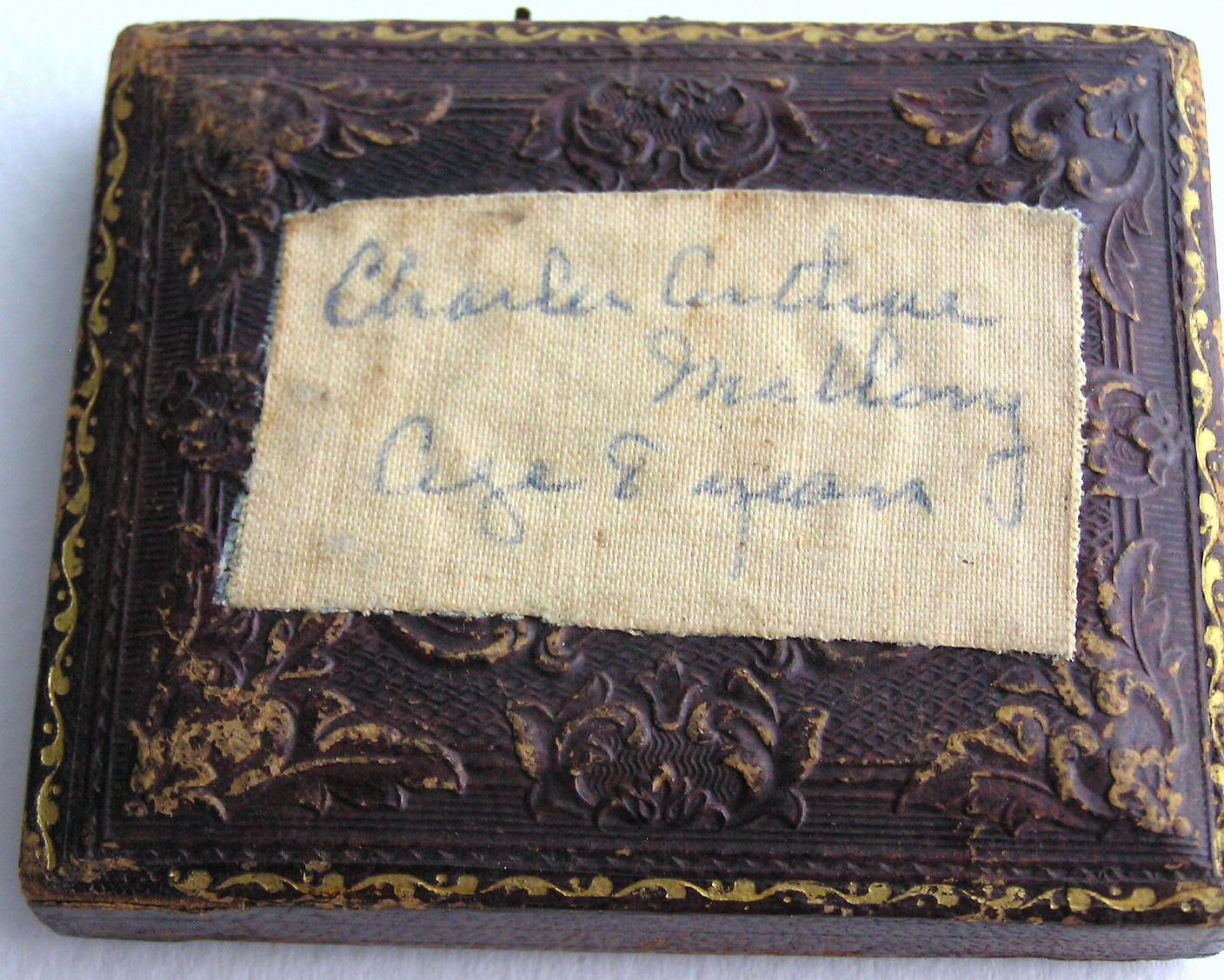 This is a tough one. The portrait is a cased Ambrotype. Most cased early photographs do not have names associated with them. This one does and we especially like to archive named portraits despite photographic quality. Unfortunately the writing is very difficult to read. We venture Charles Arltiese McLong as a beginning point in deciphering it. All that we know for sure is the Charles and Mc bits. We will attach the enclosed writing. hoping that readers might be able to help decipher the writing. We can make out 'Age 8 years'. We would have guessed that he was younger. The portrait comes from Connectict so this may have been where Charles was from. He puts his hand in his jacket, a Napoleonic pose probably used my the photographer to steady Charles' pose. He wears a military styled collar-buttoning jacket with a small rounded white collar.