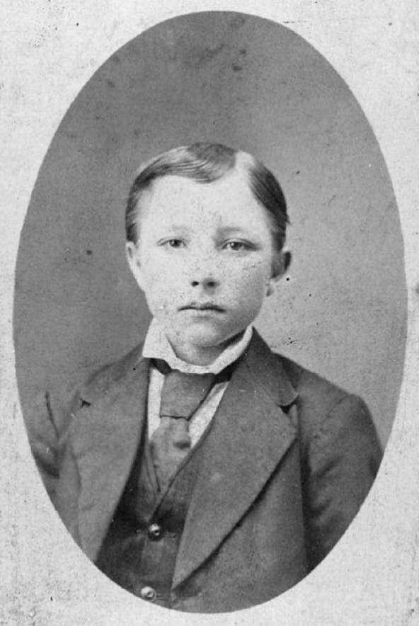 This CDV portrait shows Joe Meyer. The portrait was taken in the J.P. Weckman studio in Cincinnati, Ohio. We do not know any thing about Joe except that years later he was "Harry's father". He looks to be about 10-11 years old. Joe has slicked down hair. Its a little hard to tell about his collar, but it is probably a wing collar. He wears a neck tie with a large knot. I think this is called a Windsor knot, popularized by the Price opf Wales in Britain (future Edward VII). His suit jacket has very wide lapels. It was a three-piece suit with a matching vest. The CDV is not dated, but the clothing suggests the 1870s to us.