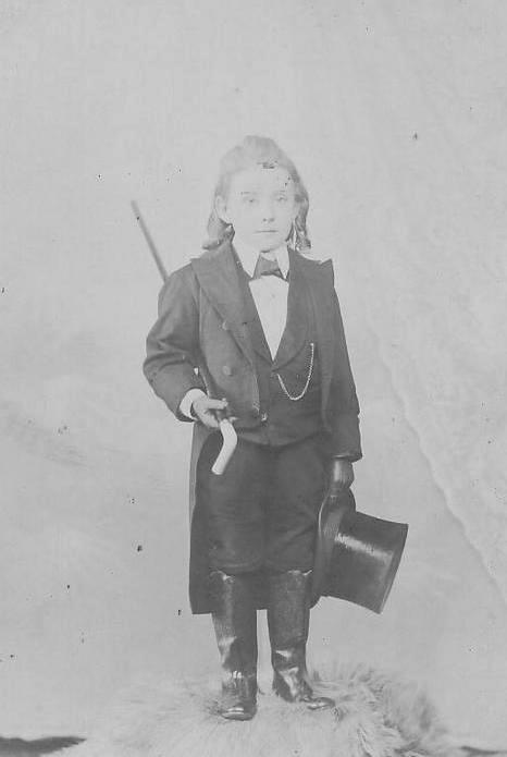 This cabinet photo shows a boy with a cane and a top hat wearing what looks like a tuxedo. I'm not sure about the neckwar. It looks rather like some sort of cross tie. The portrait may come from Missouri. There is writing on the back indicating that the boy was Arthur J. Miller. He looks to be about 6-7 years old. He has long hair which I believe have been done in ringlet curls. The portrait is undated, but I believe was taken about 1870. We have xseen commercial postcards with little boys dressed up in adult clothes. This wasn't the case here. The portrait appears to be an actual portrait ad these were clothes the boy actually wore.