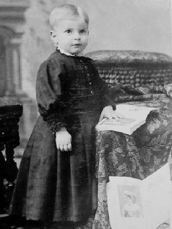 This cabinent portrait is of Ear Miller. We know little about him and his family other than he had a sister named Ruth. He looks to be about 3 years old. We do know where he was from. The photographer was Mulligan Bros., Columbus, Ohio. Earl is reading a book and has another Book at his feet. This is probably just staged, but perhaps Earl was a bit of a prodigy and already beginning to read. Earl has not yet been breeched, but he has his hair cut short. We can see much detail in his rather plain long dress, but there seems to be a small white collar. It was a dark dress with a muted pattern. I'm not sure about the color. I don't think it was black. It looks to be front buttoning. The portrait is undated, but was probably taken in the 1870s.