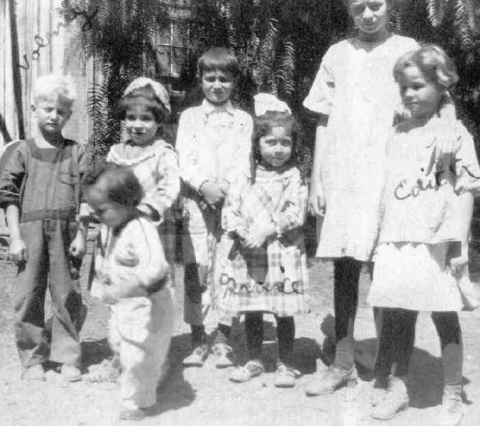 Here are four members of the Moon family (Volney, Robert, Grace and Edith, two of which were identified on the photo) in a school picture from 1907, according to the information available. The family came from Lincoln, Oklahoma. Three children in the center are wearing closed-toe double t-strap sandals. This is another example of these sandals first appearing in rural areas. We note these sandals being sold in period catalogs. I'm not sure why some of the children wear sandals and others do not. The image is interesting because it is an early image of children wearing sandals. The jump suit worn with the square-cut collar by the boy at the left is also interesting. I'm not sure about the color. Also note thar even though it seems to be a warm day, the children wear long blacl stockings.