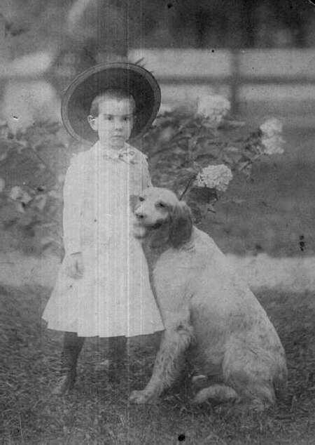 Here we see 4 year old Randolph J. Moore. We are a little unsure anout his middle initial. It is written in script and could be a T. rather than a J. His name and age is on the back of the photograph. There is no indication where the photograph was taken. He is posing with his best pal--the family pooch. We are guessing from the inscription that the pooch is Jeb Stuart--surey named after the famed Civil War Confederate calvalry commander JEB Stuart. This tells us that Randolph was definitely from the South. We are not sure what state, but JEB Stuart was a Virginian so Virginia would be a good guess. The portrait cold have been taken any time from about 1890-1910. As this is a family snapshot, we would guess that it was taken in the 1900s rather than the 1890s. Randolph wears a wide-brimmed hat, small floppy bow, and plain white dress. Unfortunately we can't make out styling details from the photograph. He also wears dark long stockings (probably black) and high-top shoes.