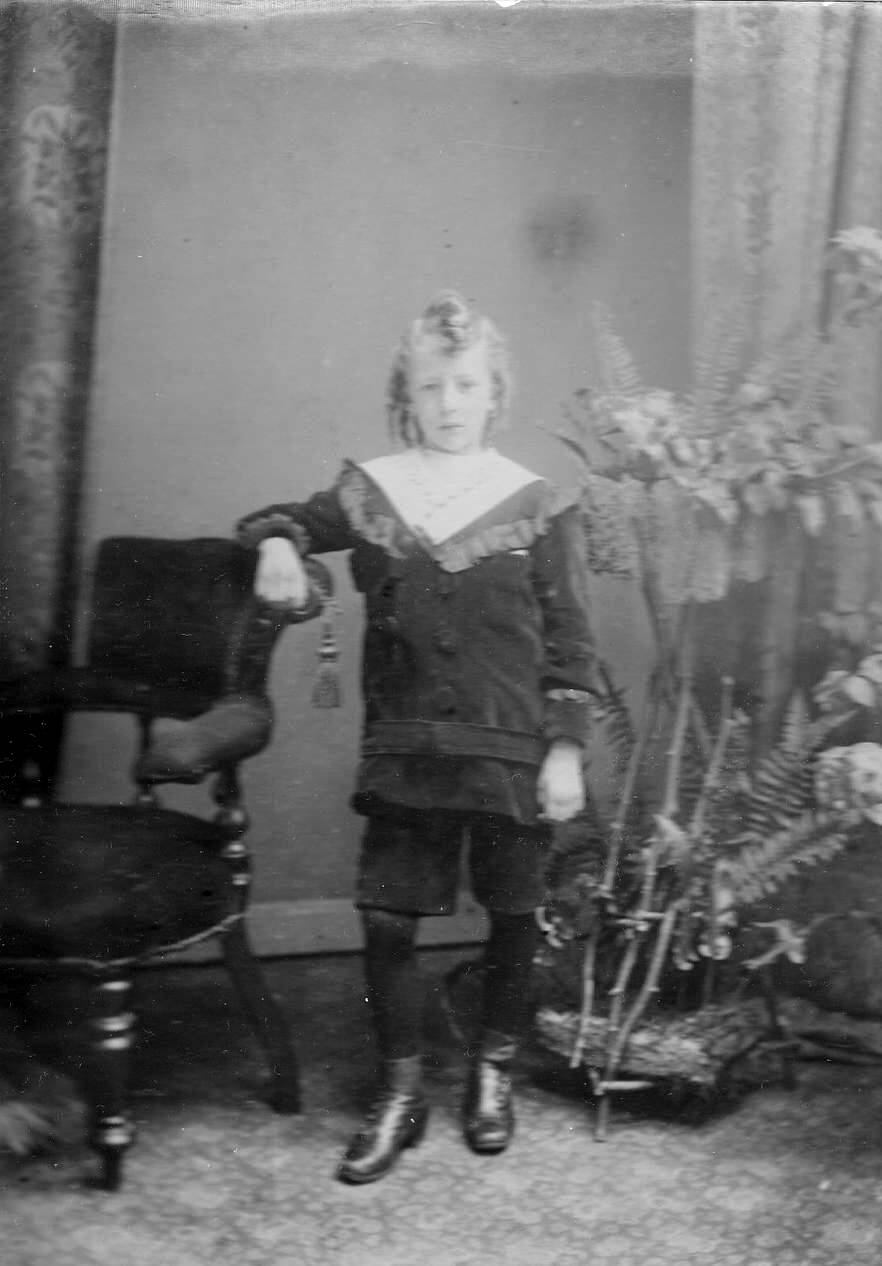 This cabinet portrait shows Robert Muir wearing a sailor-styled tunic suit with some Fauntleroy trimming at the collar and cuffs. The tunic has large cloth-covered buttons and a low self belt. It looks to be a velvet suit. It is a dark suit, but we are not sure about the color. It does not look to be black. The sailor collar is white with a white dickey and dark blue ruffles. We have not seen trim quite like this before. He has matching long stockings and high-top shoes. Robert looks to be about 7-8 years old. The studio was J.E. Mack Studio in Northern Ireland (Coleraine, Portstewart, and Ballymoney). Presumably Mack had studios in these three towns. The cabinent mount was styled a little differently than the ones we have seen in America. We are not sure how to date it. The traditional cabinet card mount suggests the 1890s. We are not sure about the chronology of tunic suit in Ulster, probably the same as Englsnd. Tunic suits in America were popular at the turn of the 20th century. We are less sure about Britain and by extension northern Ireland, but something like 1895-1905 seems likely. Boys in Ulster wear tunic suits throughout the 19th century, but the Fauntleroy and sailir styling date Robert's out fit to the end of the century ir early-20th century.