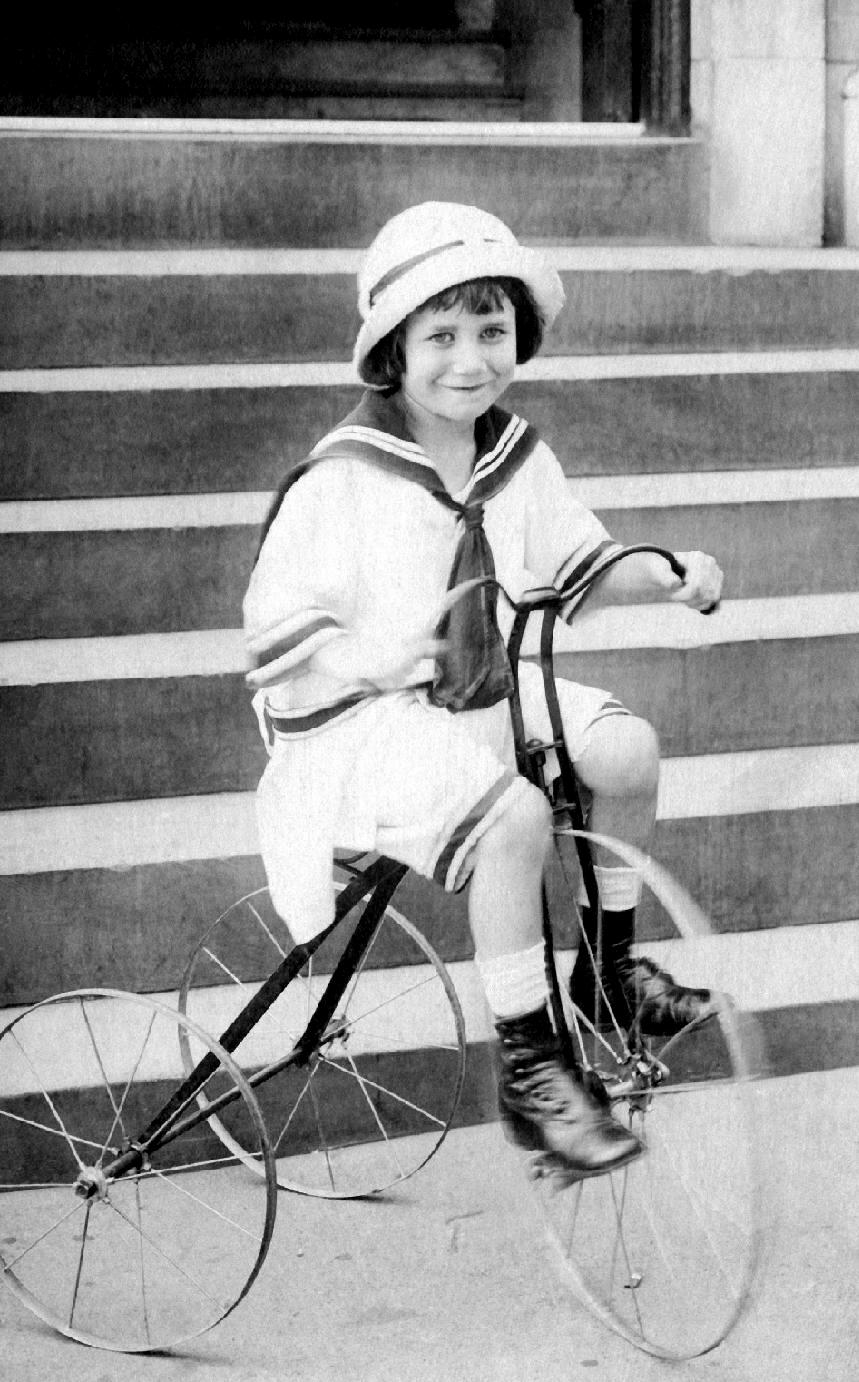 Here we see a 4-year old smiling Martin J. Murphy in 1912. Martin is looking a little mischevious. He lived in the Bronx, a New York City borough. He is enjoying a ride on his tricycle in front of the family brownstone. You can see the steps up from the sidewalk behind him. We are not sure how to descfribe his hat, probably a sailor hat with turned up brim. They were popular in the 1910s. There is a hat band that probably matches the colored detailing in the tunic suit. Unlike some styles, this was not one actually worn with sailor uniforms. He wears a white sailor tunic with color detailing, probably blue but other colors were also used like red. It has match white knee pants which have a stripe detailing at the knee hem. We think there is probably a draw stringallowing the pants to be turned into bloomer knickers. Hartin wears his tunic suit with white three-quarter socks, Martin seems to have his hair done in bangs wih longish hair at the side over his ears.