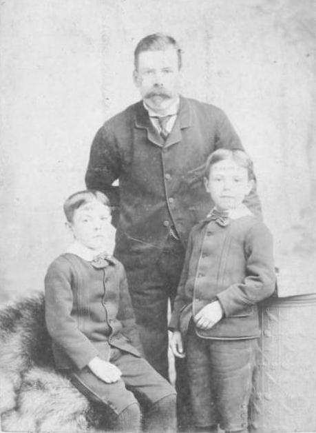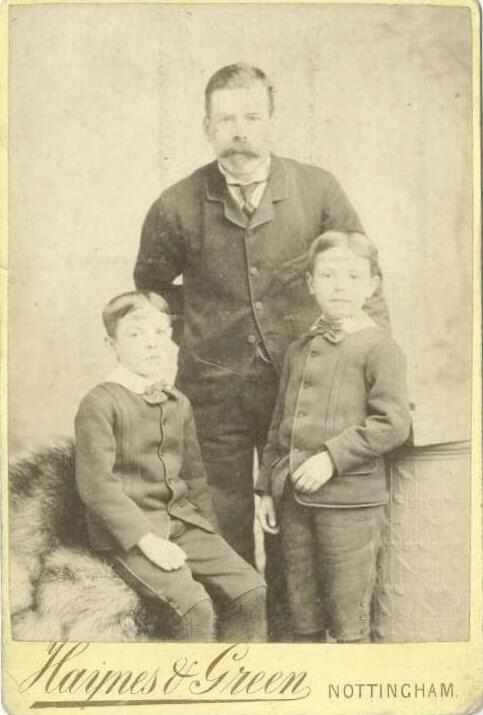 Here we see the Nicholson Brothers with their father. They were from Notingham. The image is undated, but we would guess it was taken in the 1870s, both because of the clothing and the style of the mount. We are not, however, not at all sure. One of HBC's old photograph experts believes that it is more likely from the 1880s, even the early 90s. She bases this assessment on both the card logo style and the clothing. Both boys wear small Eton collars with basic bows. (The small bows are one reason we suspect the 1870s, but the large bows seen in America were less common in Britain.) The boys collared suit jackets have a hint of Norfolk styling. They both wear kneepants with long stockings. Their father has a suit with small lapels. The bpys look to be 8-9 years old.