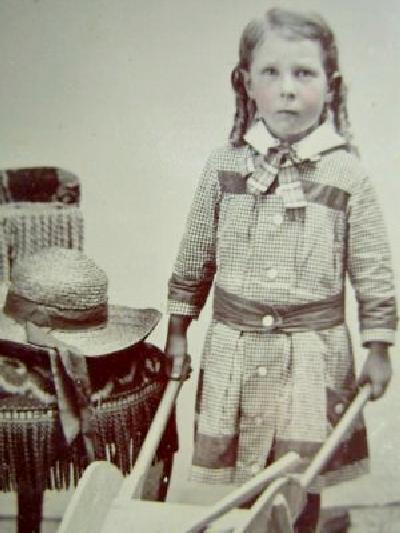 This tinted tin-type portait shows Eddie Newall, perhaps taken during the 1880s. Unfortunately the portrait is not dated. Dating tin-types are difficult because there are no clues from the mounts. I think this is clearly not the 1860s. The furniture suggests perhaps the 1870s, but the ringlets make is more likely to be the 1880s, probably the late-80-s or less likely the early 90s. The small collar and neckwear seems to suggest the 1870s. Reader insights here would be apprecited. Eddie is pictured with a small wooden wheelbarrow. Some more professionally posed than we note for many tin-types at the time. Eddie looks to be about 5 years old. He has long ringlet curls and is wearing a checked gingham dress. We are uhsure about the color. He looks like he's all set for gardening, with his wide-brimmed straw hat sitting on a chair next to him--note the long streamer. Eddie Newell was the name written on the old photo album which had this and other photographs. A little tinting has been added to create rosy cheeks.