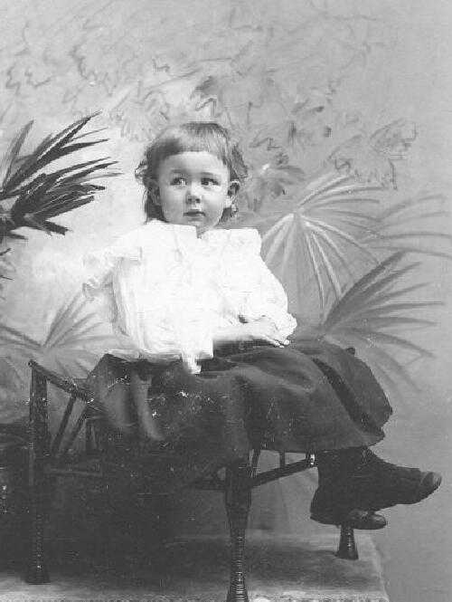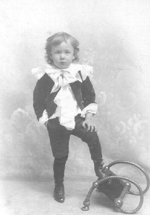 Chrles was photographed again in 1896 on the occasion of his third birthday, March 17, 1896. The family used the same photographer. Charles was wearing a Little Lord Fauntleroy suit with an elaborate Fauntleroy blouse and large bow. He was photographed by the Baldwin studio in Wichita, Kansas. He has what look like natural curls. I think he has his foot on a booy scraper. Many homes had these at the door because of the muddy streets.