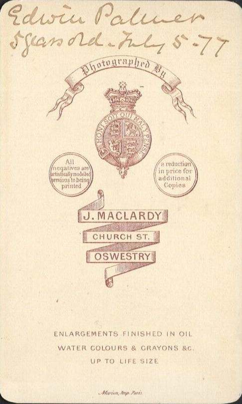 This English CDV idenified the boy, but the writing is not clear. The boy's name is something like Edwin Palunier. A British reader suggest that Edwin Pallner is more likely. He is probably correct. Local reades have a beer idea as to common names. Edwin was photographed July 5, 1877. Edwin has long hair but it is not done in ringlets. He wears a sailor suit wih white collar and a vest. He has lace up high-top shoes. He is 5 yars old. We might have gussed that he was a little younger. Edwin holds a whip, a studio prop often given to boys. The studio is J. MaclArdy in Oswestry in Shropshire, near the Welsh border.