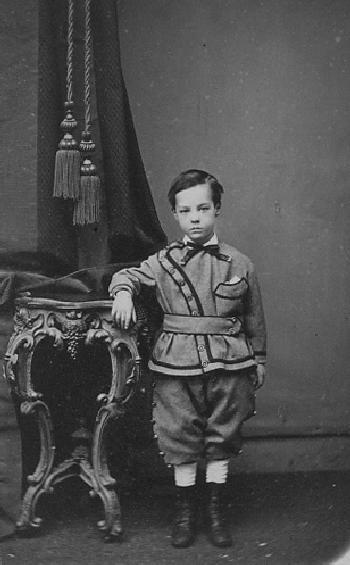 We note two CDV photos of a boy and girl, probably siblings. The boy is identified as Russell Parsons age 5 years. Russle wears a fancy tunic outfits with bloomer legs. Notice that the tunic is rather short, ratherv like a jacket. In the 1870s, knee pants became much more tighly fitted. I can�t quite make out the girl�s first name. It looks like Lizzie, but I can�t say for sure. Her last name is also Parsons and she was 8 years old when the photo was taken. Both photos were taken at the studio of H.S. Mather in Cazenovia, NY. One is dated 1869. I presume the other portrait was also taken at about the same time. The different format suggests that the two portraits were not taken at the same setting. The printing on the back is so similar that it seems likely that the two were probably taken within a year or so of each other. Notice the furniture. Many early portraits through the 1860s were takem near a table. This is because of slow film speeds and the need to steady the subject. We still see tables in the late 19th century, but the subject is less likely to be leaning on it.