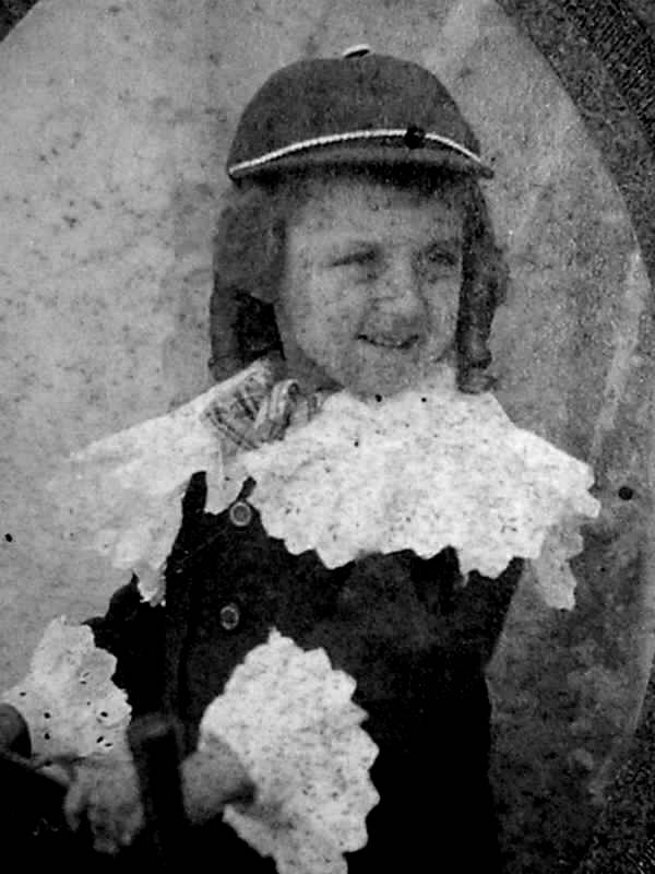 The oval portrait format cabinet card is undated, but based on the mount we can date it to the early 1900s. The boy is Sedrick Pasabumn(?). The first name is a definite. The last 4 letters of the last name is a guess based on the unclear script. Cedrick rick of course was Little Lord Fauntleroy's name, spelled with a 'S' rather than a 'C'. This could be a relative's name or mother may have got the idea from Mrs. Burnett's book. He wears a Little Lord Fauntleroy suit and fancy ruffles. A coloful floppy bow is almost burruied in the ruffles. Mother has added long ringlets. Fauntleroy suits were worn with a variety of headwear. Here he wears a sporty peaked cap, somewhat like a jockey's cap.. He looks to be about 3-4 years old.