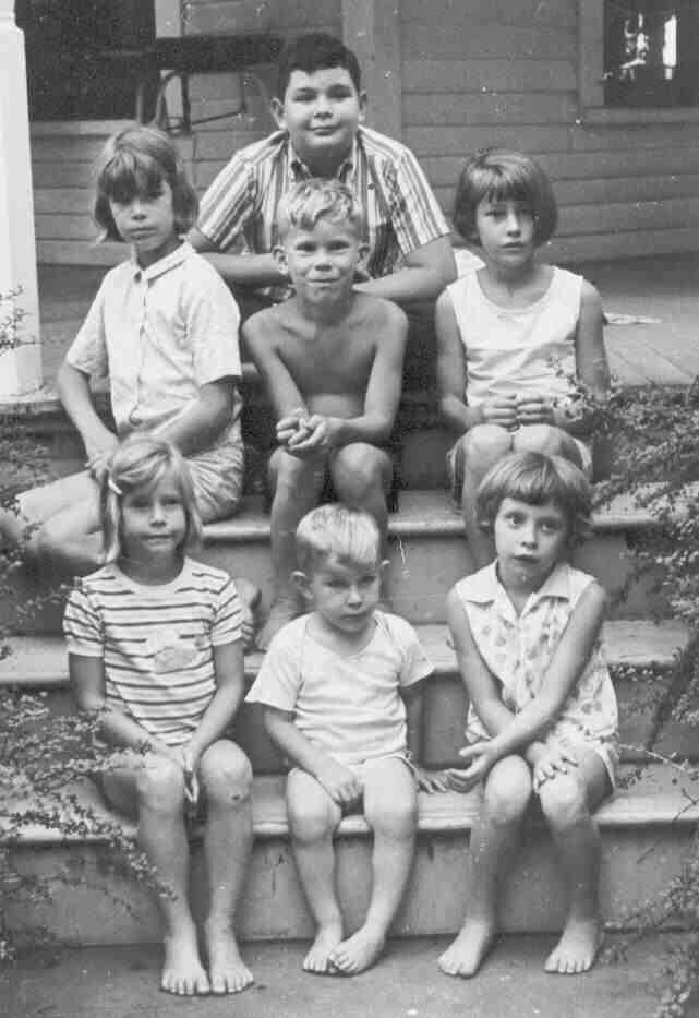 Here we see the children in the Queman family. This picture was taken in Red Creek, New York. Unfortunately it is undated, but looks like the 1960s to us. We know the children names. From top to bottom, left to right: Robert, Rosemary, Mark, Beth, Andrea, David and Betsy. Rosemary, Mark, Beth and Andrea are siblings. Their family name is Queman, a Dutch original family. Robert, David and Betsy are their cousins. The children mostly wear short pants, including the girls. The photogrph is a good example of how girls were commonly wearing shorts for casual wear by the 1960s. The children were also barefoot. This was becoming less common, but was not unknown around the home during the summer.