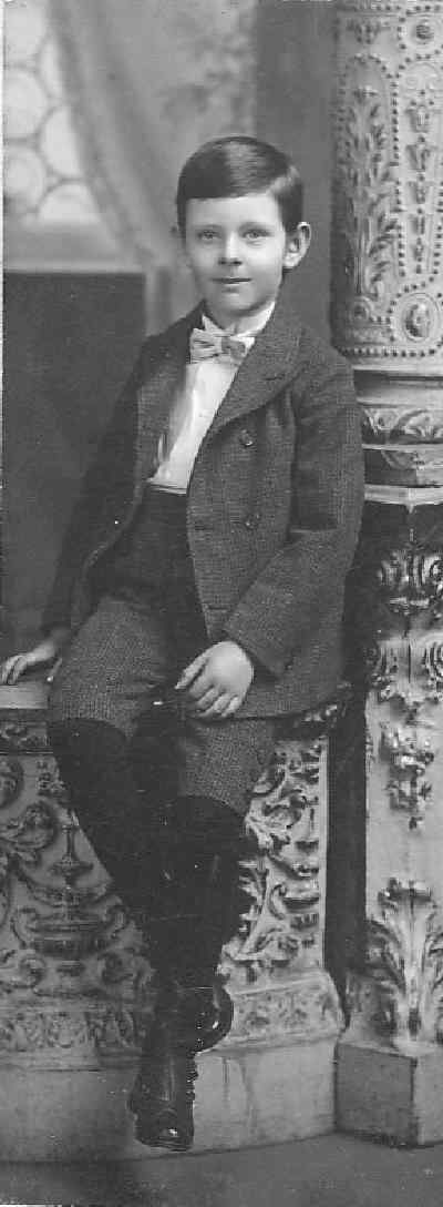 Here we have a portrait of Fred arthur Rowe taken in 1903. He looks to be about 10 years ols which means that he was born about 1893. We know almost nothing about him, other than the portrait was taken in Spencer, Iowa. Ge wears a white shirt with what a double breasted kneepants suit. The portrait is unsual in that his jacket is worn open--unusual in formal portaits at the time. He has a bowtie, but it is difficult to make out the collar style. As was common at the time, he wears long black stockings.