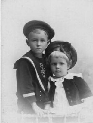 Here we see the Rolf boys from Toledo Ohio. It is a small print on a cabinet card 4 1/4" X 5 7/8 inch card. The boys are Willie and Theodore Rolf. Wiilie presumably means William. They are both wearing fahionable clothing. The older brother weas a sailor suit. His younger brother wears a classic Fauntleroy suit. The headwear is a little unclear. Unfortunately we only have a small image to work with. The older boy seem to be earing a tam. His younger boy looks to be wearing a saucer sailor cap, but we are not sure. The boys look to be about 3-6 years old. The portait is undated. The cabinet card is a little unusual, making it diffiult to date, but we would guess it was taken in the 1900s decade. The studio was Hill in Toldeo, Ohio.