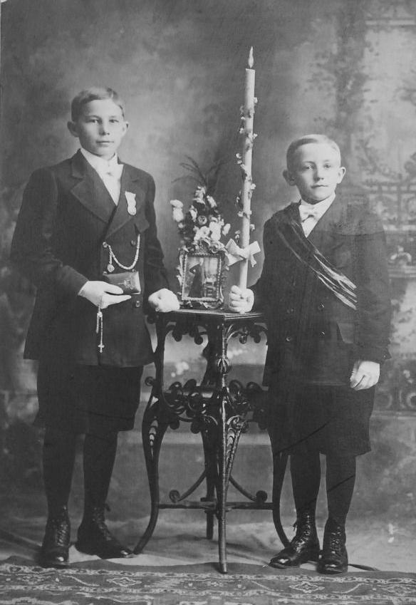 This cabinet card portrait shows two brothers, John and Joseph Ruick, participting in a religious ceremomy. The boys look to be about 8-13 years old. The clothing and mount style suggests that the portrait was taken in the 1910s, probably the early-10s. They are dressed identically in double-breasted knickers suit. The only difference we see is the youngest boy's sash and the older boy's medal. They are ethnic Germans, although their first names suggest the family has been in America for some time. There names as best we can make out the writing. We are not entirely sure just what is happening here. We think the younger boy is celebrating his First Communion. That is probably what the sash signifies, although we do not see that all that commonly. The tall candel is commonly associated with First Communion in Germany. We see that a lot in German First Communion portraits. His older brother may be celebrating his Confirmation, or perhaps he is just participating in his brother's celebration. Notice that he does not have a candel of of his own, but is holding a prayer book and rosary--also First Communion accesories. Confirmation is more associated with Protestants in Germany, but as it was so important, the Catholics began give more attention to it and there were some similarities beween Luthern (the main German Protestant denomination) and Catholic ritual.