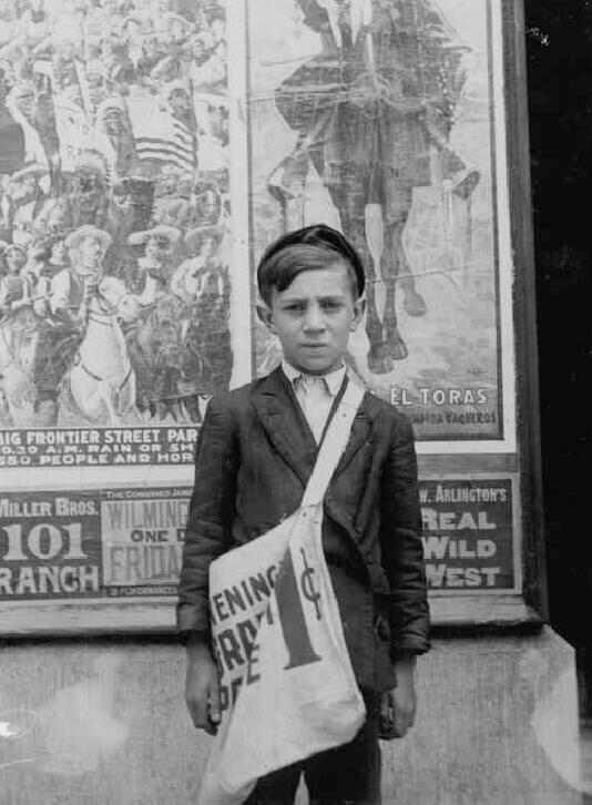 Here we have a very hard working boy in 1910. His name was S. Russell. He worked as a newsboy. He was 12 years old and had been selling newspapers for 2 years. His average earnings were 20 cents daily. Selling newspapers was his own choice. His father erarned $18 weekly. The boy deposited his earnings in the Du Pont Savings Bank. On Saturday night he worked for the Reynold's candy shop, delivering packages. He didn't smoke or visits saloons. He worked 5 hours daily, except Saturday, when he works 11 hours. He lived at 33 E. 22nd St., Wilmington, Delaware. He was photographed in front of a Wild West Show poster.