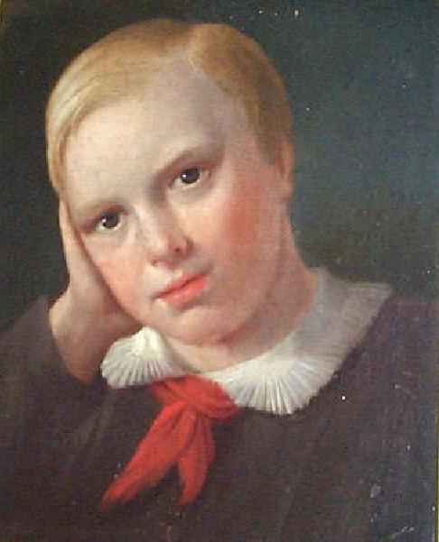 board is the name of the individual that owned the painting and not the name of the artist that painted the subject. While we agree the name may not be related to the boy, it is also quite likely that there is a relationship. The collar does not look quite right for an Italian school smock. It looks more like a collsar to a tunic an English boy may have worn with a tunic in the mid-19th century. We would guess that it might be English, in part because of the name. The portrait was for sale in Toronto, Canada which agains suggests it is English. The portrait is undated, but we would guess the 1840s, although we are not at all sure. I am not sure what the boy is wearing, but he is wearing a white collar edged with little plears and a small red scarve.