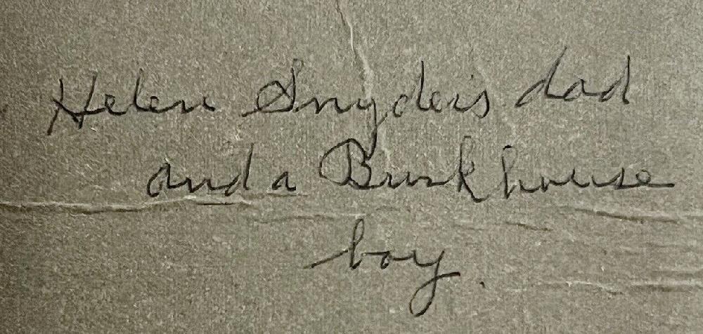 Here we have what must be two brothers from New Bethlehem, Pennsylvania. This is a small town located north of Pittsburg in the western part of the state. The population peaked at about 1,600 people in 1910, about when this portrait was taken. The boys look to be about 5-7 years old. Boys of similar age photographed together are almost always usually brothers, especially if they are holding hands. What we find a litle confusing is the inscripion on the back of the cabinet card, probably meant to be a little humerous. "Helen Snyders dad and a [Bunk house?] boy." We will attach a scan of the back in case readers want to try to make it out better than us. But we take it the boy's last name must be Snyder. Their first names unfortunaely are lost to hstory. The cabinet card portrait is undated, but the mount style and the boys' outfits help us to date it to the late-1900s decade, perhaps about 1910. It is a new style mount done in a greenish grey, a popular color in the 1900s decade. The boys seem to have some kind of brimless caps, a style we have not noted very commonly. Flat caps became standard in the 1910s, but there was sill xonsiderable diverity in headwar during thev1900s decade. They both wear blouses with prominent Eton collars. The blouses are different styles. Interestngly mom has done their neckwear differently giving the boys a different look. The older boy wears a large floppy bow, something that was declining in popularity by the 1900s. His younger brother's neckwear is done differently. It is contained by two blouse tabs--something we have not seen before and not fied in a bow. Note that these are blouse suits with the blouses matching the pants. The boys have different pants. The older boy has knee pants. Hus younger brother wears he new knicker style. We beleve what is captured here is the startelling transition from knee pants to knickers which for some reason occurred suddenly about 1908-09. They both have black long stockings and high-top lace-up shoes.