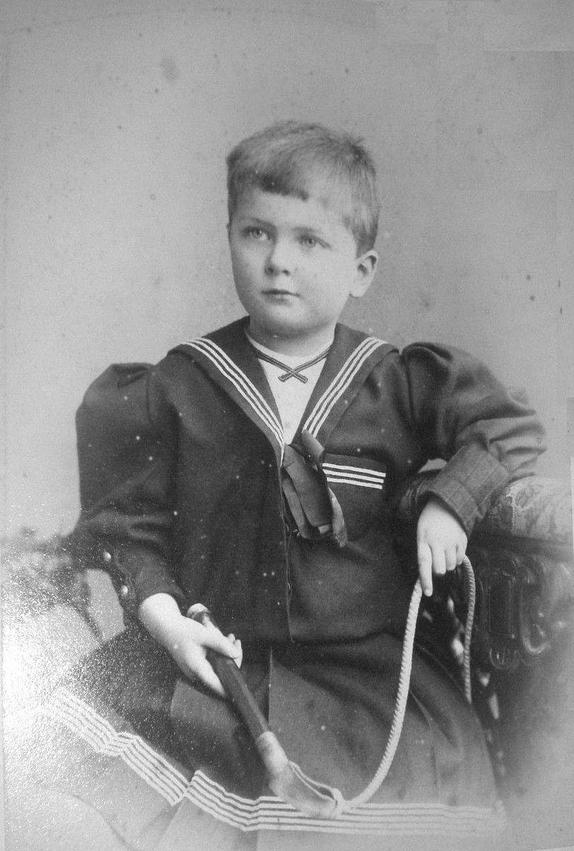 This classic cabinet card portrait shows English boy Theodore Quintus Studd wearing a classic sailor-style kilt suit. We do not know how old Teodore was, but he looks to be about 4-5 years old. The portrait was taken in 1896 so he would have been born about 1891. The kilt suit was a very popular boy's style n americ. We see them in Britain, but not nearly as commonly as in America. We know nothing more about him. Theodore's sailor blouse has trafitional three-stripe styling although his dickie has an unsual cross-tie pattern. Note the balooning of the sleeves. That was a very popular dress style at the time and was not use in standard sailor blouses. His kilt skirt has box pleating and stripping at the hem. Notice the whip, often used as a prop when younger boys were photograohed in skirted garments. The studio was Browning in Exeter.