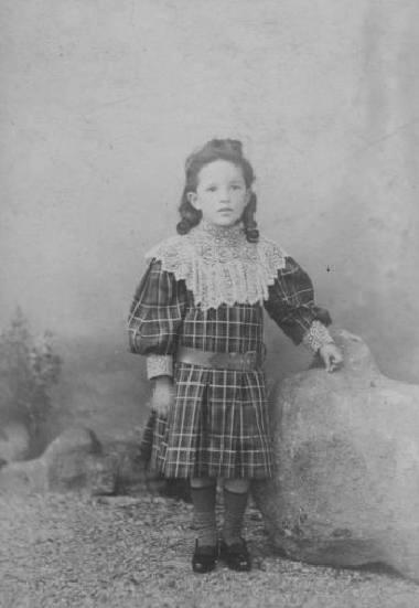 Maurice wears a tartan dress with a large lace collar. Tartan was a popular pattern for boy's dresses because it suggests a kilt. Mote the balooning of the sleeves. Mairice wears colored socks, almost knee socks. I'm not sure what color they may have been. He looks to be wearing patent-leather pumps. His hair is done in long shoulder-length ringlets. There is writing on the back which a French reader has deciphered for us. Maurice's mother has written, "Maurice Terrillon,