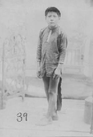 This cabinet portrait shows Theodore Red Eagle dressed in his summer clothing. The portrait was taken by Oscar Drum at the Parsons Gallery in Pawhuska, Oklahoma Territory. Pawhuska was in the northern area assigned to the Osage Nation. Today this is Osage Couhty. The portrait was indexed number 39 in pen on the front of the card mount. Numbers like that are unusual on cabinent cards. We suspect that the photographer made portraits of a school or some other group. There is a pen description on the back, "Theodore Red Eagle. That is the way Indian children drill in summer". Also added on the back was "From Bruce to Payson", although the second name is indestinct. The reference to drill suggests that Theodore was in a school group. The portrait is undated, but was probably taken in the 1890s. The Olkahoma Territiry was organized in 1890. And as the mount style was common before 1900, the portrait was taken in the 1890s. He looks to be wearing a kind of tunic without pants. We can't tell if there is a long clothing hanging down behinf him or if it is some kind of pole. Drill was a common activity in schools during the 1890s. It was seen as both beneficial physical exercise and useful discipline.