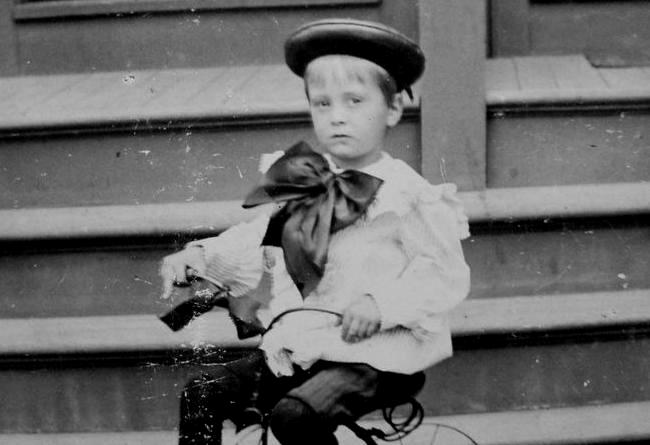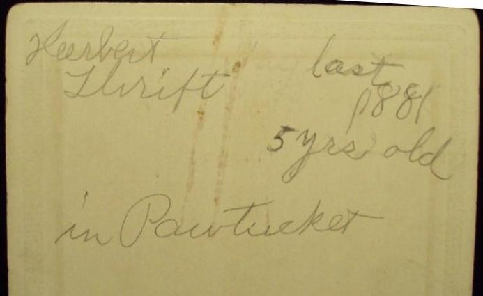 The boy in this cabinet card portrait is Herbert Thrift. He seems ti have identified himself on the back of the mount. He is riding a steel-wheeled tricycle, presumably a studio prop. . He is dresses in a Fauntleroy blouse an enormous floppy bow, knee pants, and black long stockings. He also wears a cap, but I'm not sure just what type it was. The photogrpher was Davis and Douglas, 58 South Main St., Fall River, Massachsetts. The portrait, however, was not taken in the studio. The back has writing in pencil Hurbert Thirft, Last ?881, 5 Years Old in Pawtucket". We do not know what 'Last' meant. We at first thought that meant the portrait ws takrn in 1881, but we do not believe this was the case. Neither the mount or the clothes look to date to 1881. We would say the 1890s is more likely.