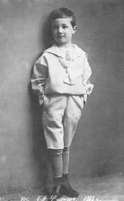 The studio portrait of Count Nicolas Alexandrovitch Tolstoi (1907-17) was taken in 1913 when he was 6 years old and only 4 years before his early death. I am not sure if he is related to the famous author. Nor do I know if his death was connected to the Revolution hich broke out in 1917. He wears light colored sailor suit with knee pants and brown long stockings.