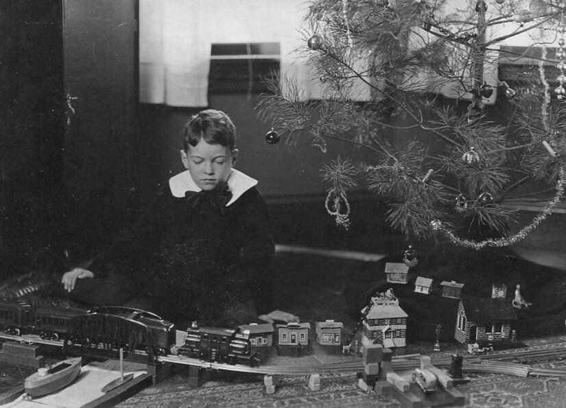 Here we see Dick Trippe in a Christmas scene. Is proper name would have been Richard Trippe. Dick didn;t have much of a Christmas tree, but he has a great tain set. It is a little difficult to tell, but it does not seem to be an electric train. Its a little difficult to see what he is wearing as it is almost all black. He wears a short pants black suit with a very large white collar and floppy bow. Large collars and fkloppy bows were less common after World warI,but we still some younger boys wearing them. He wears black long stockings and high-top shoes. The portrait was taken in 1921. He looks about 7 years old. We do not know where he lived in the United states.