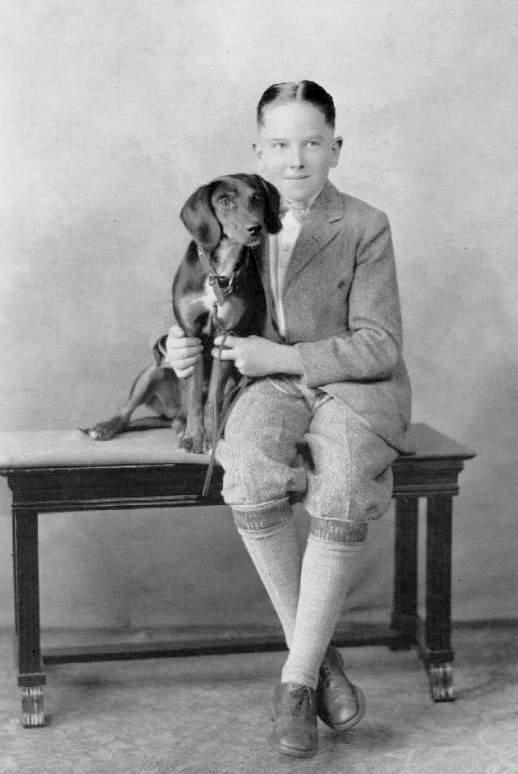 Here is a studio portrait of Gordon Tripp of Utica, New York. Gordon appears with a great pooch. You just know the two had a wonderful time together. The dog is also identified on the back as "Duke." Gordon wears a light-colored single-breasted knickers suit with what look like matching knee socks. It can not be seen in this print, but the jacket had a Norfolk self belt. The knickers have a sharp crease. He has a light-colored bowtie which is difficult to see. He also wears low-cut, brown oxford shoes. Notice Gordon's bnear center part. He looks to be about 11 years old. The portrait is undates. We would guess it was taken in the late-1920s or perhaps the early-30s.