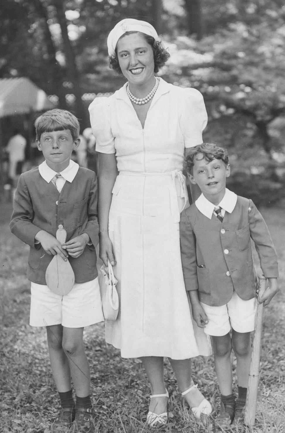This press photo shows Mrs. Richard Tucker with her sons Richard and Sam. The boys look to be about 6-9 years old. They wear identical Eton lapelless jackets with crisp white Eton collars and what may be school neck ties. The collars look to us like detachable collars, in part because of the size, but e are not entirely sure. We are not sure what color their suit jackets were, perhaps light blue. They are being worn like blazers here with summery short pants. Our guess is that they were part of a matching short pants suit. But mother has dressed them in white shorts, presumably as a summer touch. The boys also wear dark ankle socks and two bar closed-toe sandals. Mother is fashionanly dressed for a social outing in a summery white dress. Interestingly the boys' hair is done differently. Richard's hair is done in bangs, but not his little brother. Given they are dressed alike that is a little surprising.