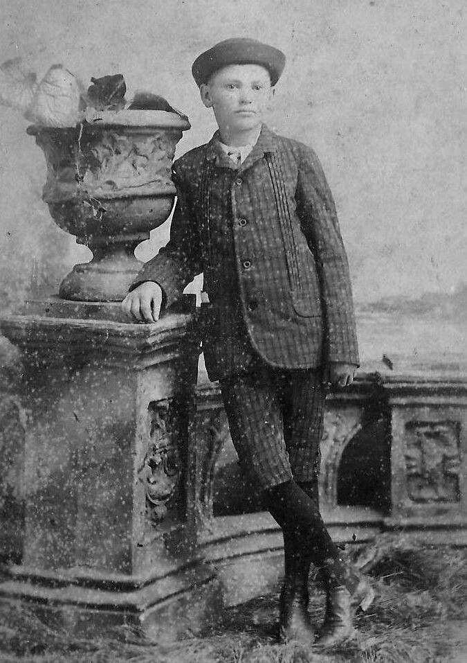 This cabinet card shows an American boy wearing a knee pants suit with some Norfolk syling. And he wears black long stockings. He also has a soft, turned-up hat. We know the boy is Ed Turner as he has written his name on the back--although not very clearly. He looks to be about 11 years old. The studio set is a classical balustrade and vase. Unfortunately the portrait is undated which is unfortunate as it would help build time frames for various fashiins and vabinet cared features. The dealer suggsts the 1970s. We think the late-70s is certainly possible, but the early-80s seem more likely. The sjort knee panrs and blacl long stockings are both clues. We also think the soft hat is more charactetistic of the 80s. The photigrapher was WW Darnell in Redforth, Virginia.