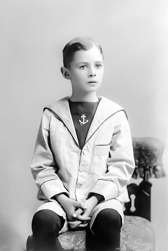 Here we have a portrait of Arthur Upshaw. We do not know where in lived in the United States, but we know the portait was taken in 1898. Arthur looks to be about 8 years old. He wears a light-colored summer sailor suit with a dark dickey and an embrodered ancor. It was an unusual style. The top is more like a jacket than a blouse. The jacket is done wih narrow dark piping and a rather distinctive pocket. Arhur's suit is done with knee pants and worn with black long stockings, both standard for boys at the time. We see that quite a bit at the time, a light-colored outfit worn with black stockings. We see this for both boys abnd girls. His hair is heavily slickdowned as was popular at the turn-of-the-century.