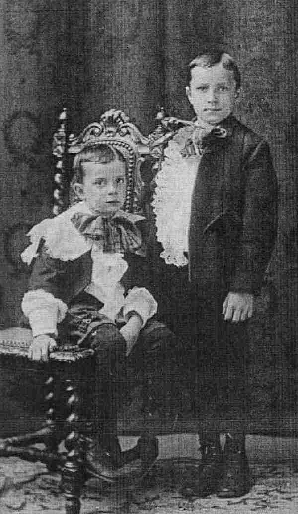 Here we have the Whitney boys in Brattleboro. This one shows two elaborately dressed boys from the Whitney family. One source suggests that the portrait was taken in 1917, but it looks like an earlier portrait to me. We don't know their Christian names. The boy sitting on the chair wears a Faunterloy suit with a ruffled blouse and a large lace collar. Notice how much shirt sleeve shows under the short jacket. Notice also the clasp of his hose supporter which can be glimpsed at the hem of his knee trousers. The older boy sports a fancy ruffled jabot running down the front of his shirt. He also seems to be wearing a knee-pants suit with black stockings. Both boys wear large bows at the neck. The boys seem to be aged about 7 and 11. This photo looks like a studio portrait. Notice the draperies at the back, the carved chair, and the oriental carpet.