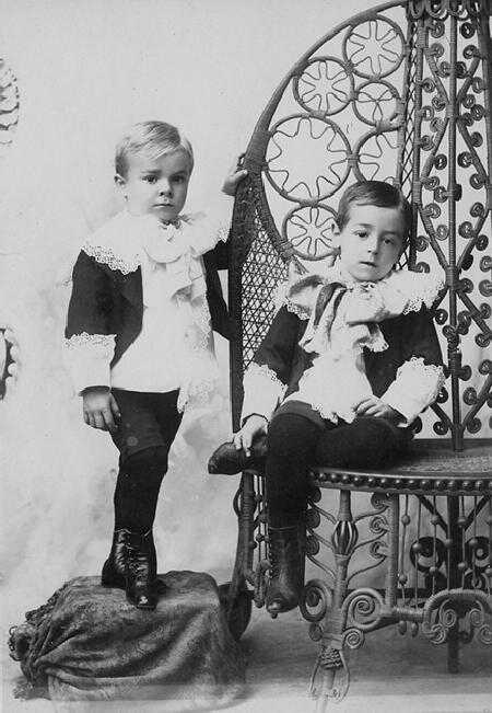 This cabinet card is a portrait of “Eddie Young, age 5 and Ralph Young, age 3. Their parents were Mr. and Mrs. Barie G. Young. The portrait was taken by Franck in Hammond, Indiana. It is not dated. The dealer estimates 1896-98. I think this is a good estimate. The Fauntleroy suits were popular in the 1890s and classic suits like this began to become less popular after the turn of the 20th century. The light-colored cabinent card mounts became popular in the late 90s. HBC is not yet an expert in furniture, but we believe that whicker furniture was especially popular in the late-90s and 1900s. The boys seem to be wearing identical classic Fauntleroy suits. The only difference we can see is tht the floppy bows look to be different colors.