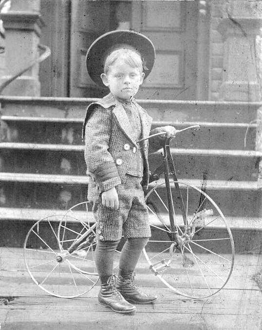 This cabinet card portrait shows Ray Young standing in front of his trusty tricycle in front of his home. The portrait is undated, but it is a new style mount suggesting that it was taken about the turn-of-the 20th century. Ray wears a knee pants sailor suit conplete with a saucer-style hat, a popular style at the time. He looks to be about 5 years old. After the turn iof the century, we begin to see cabinet cards like this. It looks like a snap shot dad took, but mounted like a studio cabinet card.