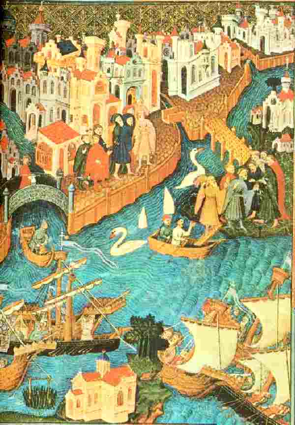 The Polos became very wealthy in China in the service of Kublai accumulating both gold and jewels. As he grew older they became concerned about their position. They were attached to his service and thre was no guarantee that the next Khan would look as favorably on them. Kublai was reluctant to allow them to leave. The assignment of escorted Mongol princess Kokachin to marry the Persian prince Arghun provided the opportunity. The Polos traveled west by sea. They traveled through the South China Sea to Sumatra and then into the Indian Ocean, finally reaching Hormuz in the Persian Gulf. Marco did not go into detail concerning the sea journey, in contrast to some of his accounts of land journeys. It took 2 years and large numbers of people died on the voyage. We are not sure just what transpired, bit there are a wide range of theories (diseases like scurvy or cholera, storms, or attacks by hostile natives and pirates). When they reached Hormuz they found that Prince Arghun had died 2 years earlier. The Princess thus married his son, prince Ghazan. They also learned that Kublai Khan had died (1294). The Polos still had his golden tablet of authority which allowed them to travel safely and receive aid and assistance from local authorities, not only supplies and horses, but armed escorts. They traveled north to Trebizond on the Black Sea. And then by sea via Constantinople to Venice. They arrived home and at first no one recognized them (1295). Their family believed that they had perished long ago.