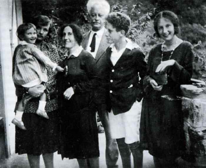 well-known novel is "The Grey Birds" (1939). Some availavle family snapshots show how his children were dressed. Here we see Van Schendel with his family and children in 1927. Notice the teenage boy (aged about 15) wearing typical Dutch gymnasium (high school) clothes--a dark jacket with white (or brass?) buttons worn with a white, open-necked shirt, white knee pants with button trim down the sides, and long black stockings. Judging from the foliage in the background the season seems to be late spring or summer.