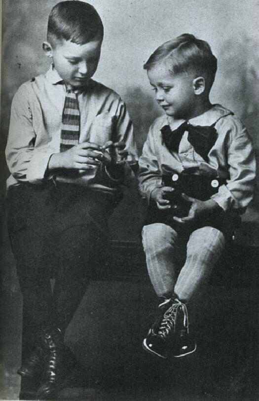 The Walton boys were born near Kingfisher, Oklahoma. Sam was born in 1918 and James ("Bud") in 1921. They lived at firstv on their parents' farm. But the Walton family moved in 1923 to Missouri where they moved around from one small town to another for several years. This portrit here was taken about 1924 when the boys were 3 and 6 years old rspectively. It was in Missouri that he worked in his father's store while going to school. Unlike some children who have to work in their father's store, he actually enjoyed it.