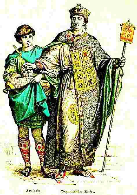 We believe that clothing styles in Byzantium of the time of separation with Rome were similar to the styles worn in the West. We have little information at time about subsequent clothing styles or about differentiated styles for children, if any. An ancient clothing specialist tells us, "I have not done a lot of research on children's clothing during the Byzantine period. My impression is that children dressed much as their parents - the few children that I recall seeing in illuminations were dressed in miniature versions of adult's clothing. I have made a dalmatikon and esoforion for my toddler. I simply used the same form as for his father - mostly a t-tunic - and then embellished the dalmatikon. Since male headwear was not common, there isn't the need for that. Which is good, if you've ever tried to keep a hat on an active toddler." [Eirene] Romans in both the Western and Eastern Empire made clothes clothes with linen, animal skin, and wool. Silk obtained over the silk road was enormously coved and very expensive. Anyone who could afford it wanted it. It seemed luxurious in comparison to linnen and wool garments. Silk thus became a symbol of wealth and social status. We note little change in men's clothing over the centuries, but our information is still limited. The basic garment in Byzantium as in the Westrn Empire was the tunica. Other garmnts included the dalmatic, the cloak and shoes or boots. The cut and style of the garments were the same for all classes. The diiferences among social lasses were in the the fabric, quality of weave, and trimming. The tunica was the basic garment worn by men in Byzantium. The working classes wore the tunic as the basic every day garment. The ruling classes also wore the tunica, but only as a basic garment and wore luxurious garments over it. The Byzantine tunica developed from the basic Roman tunica talaris which was an ankle-length tunic. The Byzantines added trim to the sleeves and wore their tunicas with a very loose fit. Those involved in ekmployments which required strenous activity would gird his tunica with a thin belt. Sleeve length varied depending on social class as well as the season. The coptic tunic was designed for more active wear. There were also tunics for workers. Dock workers for example wore a himation, an ancient, inexpensive tunic formed from rectangles of cloth pinned at the shoulders and belted. The dalmatic is the destinctive garment most associated with the Bzantines. It was a kind of robe worn by the ruling classes over their tunica. The dalmatic was if the wearer could afford it made of a luxurious cloth, commonly silk, and richly decorated. Common people might have a dalmactic that they would wear for special occassions. Unlike the tunica, there were changes in the dalmatic over time. An important difference which came to destinguish Byzantium with Rome was pants or breeches. Byzantines did wear leg coverings of varying types. There are breeches makers clearly shown in Diocletian's Edicts of Prices. This means that they were worn from the very beginning of Byzantium. It is unclear, however, how common leg coverings were. This may have varied seasonally. This is not well explained in available texts, but art work provides some glimses of clothing styles. Shepherds are depicted with leg wrappings from ankle to knee. Note the imperial page with leg wrapping to the knee shown here (figure 1). Dock laborers are shown, however, with bare legs. The Emperor Justinian is known to wear hose. The breeches worn by the Germanic tribes seem to have influenced Byzantine dress. Byzantines seemed to have worn these breeches in areas where was extensive contact with the Germans. Acceptance seems to have varied over time. The Byzantines also wore loose fitting trousers which were adopted over time. [Tauna]