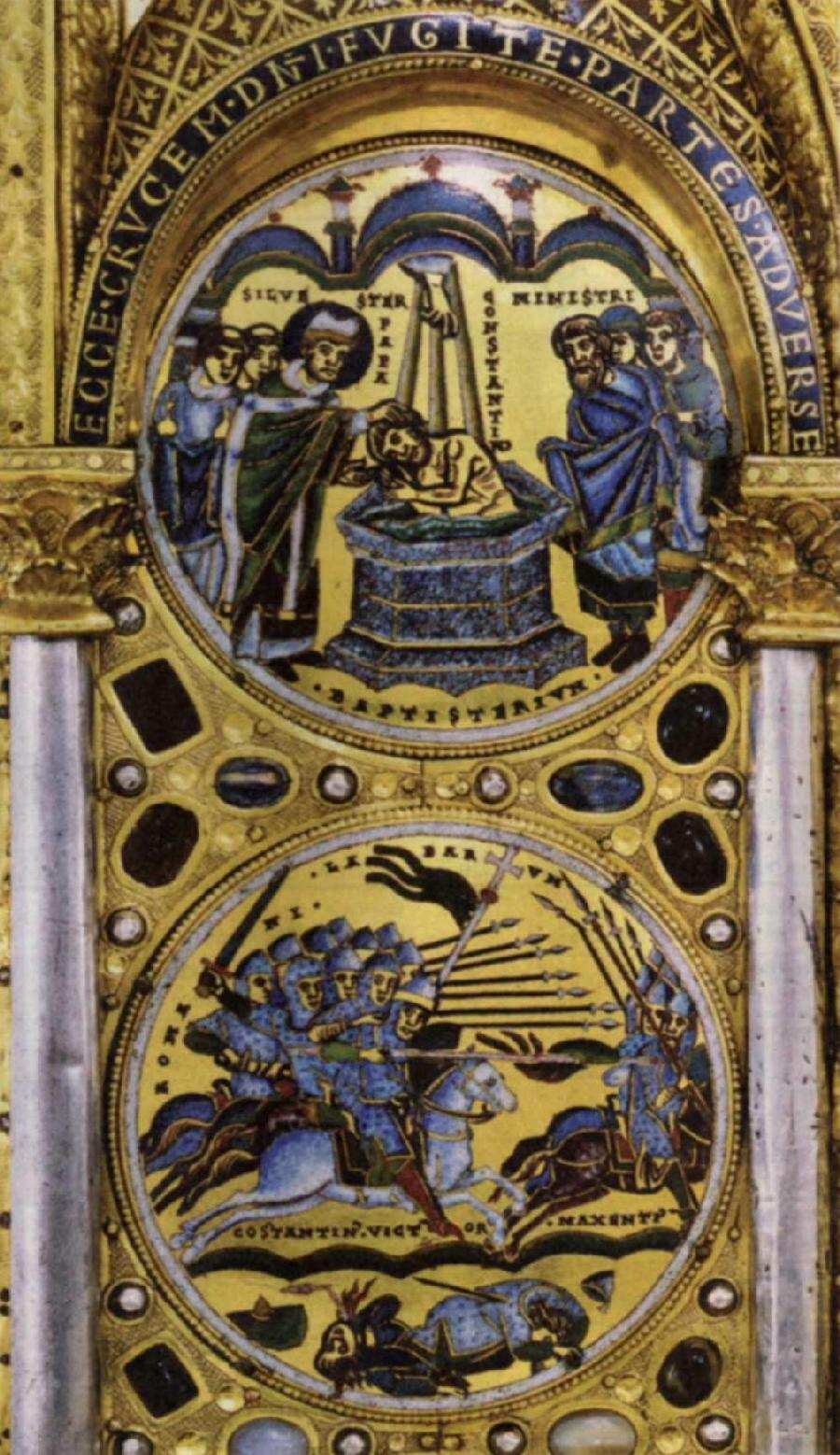 There was among Roman soldiers a well-established dybnastic instinct. Loyalty was all to often to their commader rather than the Roman state. Diocletian's death led to civil war. Constantine met another imperial contender, Maxentius at the Milvian Bridge leading into Rome (312). Constanine had the smaller force. He instructed his soldiers to paint a symbol composed of the Greek letters 'chi' and 'rho', telling them it was a symbol of divine support. It also meant Christ--Christos in Greek. It is unclear how many of his soldiers made this connection. [Potter] Constantine's victory at the Milvian Bridge propelled him to gain control of the Empire. The victory is commemorated on the Arch of Constantine, the most famous of all Roman victory arches erected in the heart of Romevnext to the Colliseum and Forum. Stories of Constabtuine seeing visions of Christ and a great cross in the sky appeared much later and only became widely publicized after Constantine's death. Some may have been actually described by Constine, but this is virtually impossible to prove.