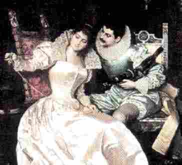 commonly appeared in square-gable headdresses (English hoods). Men commonly hung purses, keys and pomanders from their belts as pockets were not yet common. [Crush] With the fortunes being made in the expanding economies, Europeans by the 1540s could afford increasingly splendid clothes. The square look became ibcreasingly pronounced. Men wore flat hats with padded crowns, often decorated with flowers. There were increasingly large padded sleeves that were cut to display rich linings. [HBC note: Medieval clothes were often simple and high functional reflecting the economic conditions. When ever elabborate styles appear using extra materail for no practical reason, it is often the sign of a properous and expanding economy.] It was in the mid-16th century that the foreunners of modern trousers appeared. They did not look like trousers. In fact they looked more like children's rompers of the early 20th century. They were called trunk hose and were padded breeches, often padded and blouced out to the extreme. They were worn with colored hose. At the time men proudly displayed their legs, but women's legs were distretely hidden under long gowns. While long, women's skirts were cut to display richly embroidered underskirts. The round French hood increased in popularity. [Crush] It was in the 16th centuring that the term breaching appeared. Young boys were dressed in the same gowns an dresses that girls wore and did not begin wearing breeches until about 5-6 years of age, although this varied. Neck ruffs sometimes quite elaborate were fashionable by the 1570s. They were worn by both men and women as well as children. Stays or corsets were also sommon for both men and women as well as some children. Both men and boys wore a sleeveless jerkin over often stiffy padded doublets. Wonen wore long, often highly ornamented gowns with a padded bondice (stomacher). The skirts of women's dresses became wider and farthingales were introduced to hold them out. [Crush]