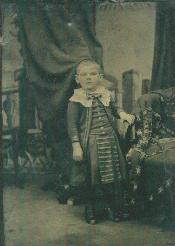 Many boys wore relatively modern-looking suits with small collars and bow or other small collar adornment. The suit jackets were generally plain in comparison to the Fautntleroy suits that were to appear in the 1880s. They were often better tailored than the often formless suits of the 1850s and 60s, but not as well tailored as the better fitting suits which became more common in the 1880s. Some jackets buttoned at the collar, making any kind of collar or bow unecessary. Knee pants for boys were becoming the increasingly accepted norm. Quite young boys might wear long pants in the 1860s, but this became less common in the 1870s as more boys began to wear knee pants, usually with long stockings. Not only did knee pants become increasingly common, but older boys began wearing them. Sailor suits were becoming populsr, at first in Englnd. A good example is English boy Osborn Richards in 1876.