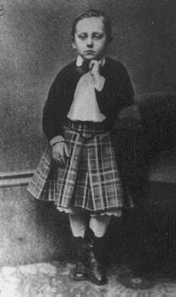 The kilts popularized by Queen Victoria continued to be a popular style for boys. The style reached America in the 1840s, but it was not until the 1870s that large numbers of American boys--most with no or only the most tenous conection to Scotkand--were outfitted in kilts. It seemed an ideal choice for mother who were not yet ready to breech their sons. The kilt was the height of fashion for boys in England and France. It also crossed the Atlantic. It was not the Highland kilt, however that proved popular in America, but rather the kilt suit that had virtually no relationship with a true kilt, other than both were skirted garments.